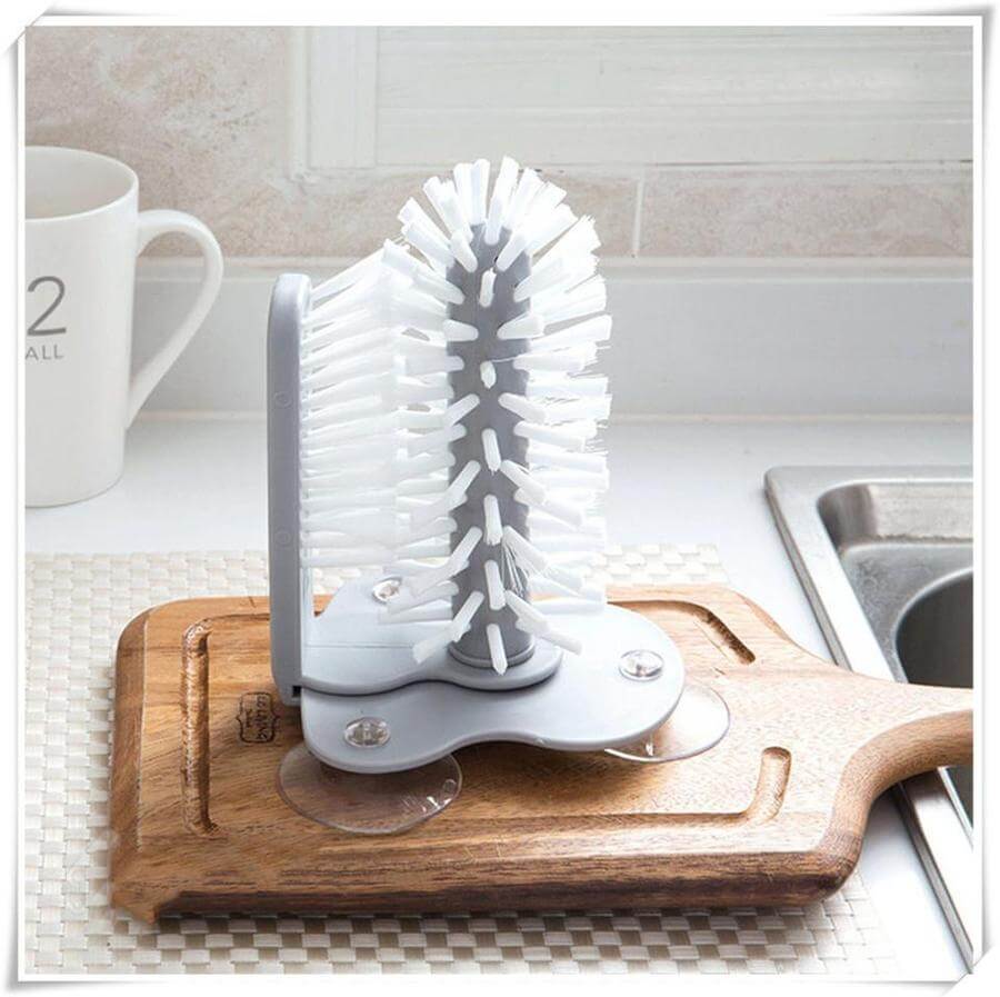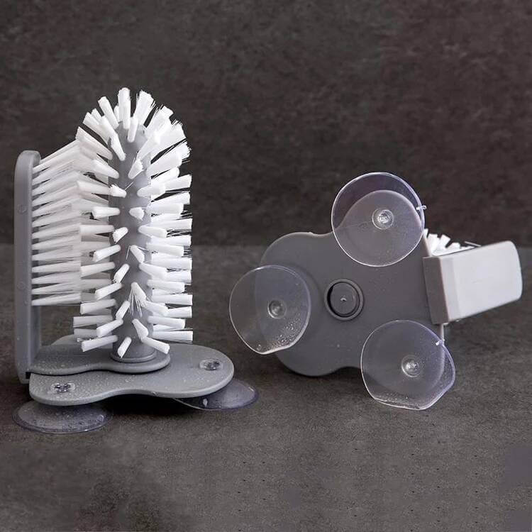 Reinigingsmethode - Wordt met zuignappen op de bodem van de gootsteen bevestigd, schuif het glaswerk tussen de twee sets borstelharen om beide zijden van het glas in één keer te reinigen,360 graden zonder dode hoekreiniging. Maak van het schoonmaken van uw glaswerk een makkie. Er zitten drie zuignappen op de bodem van de borstel.