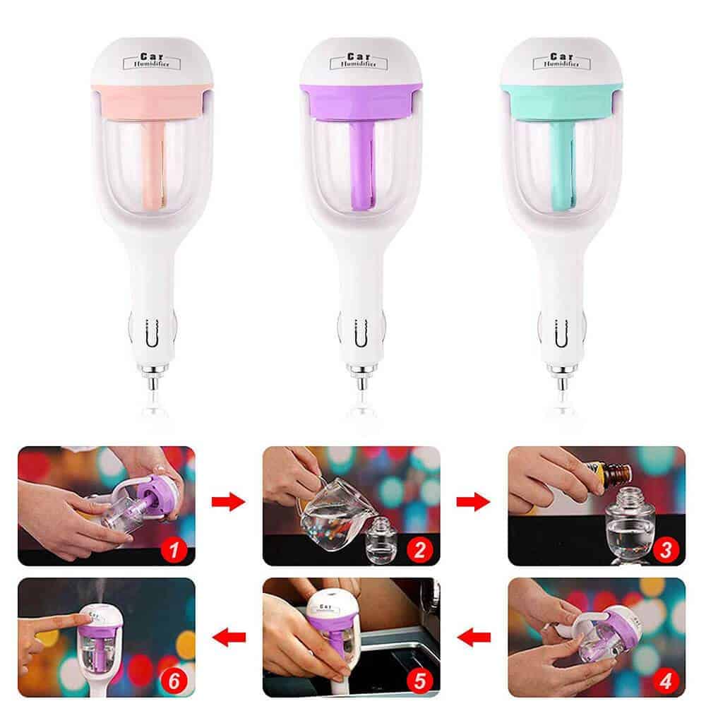 - Bevochtig de lucht - Ontspannende ervaringen van dit apparaat met je favoriete geuren! Verfris en bevochtig de kwaliteit van de lucht die je onderweg inademt. De diffuser geeft een koele nevel af die vocht toevoegt aan de lucht. Het verwijdert droogte, helpt droge huid, lippen, sinussen, en hoesten.