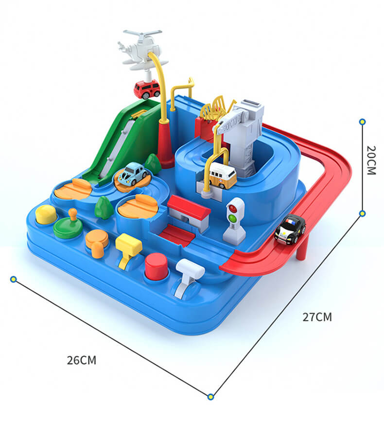GRAPPIG AUTO AVONTUUR SPEL: Het Car Adventure Toy is een leuk en ideaal speelgoed om de uitgebreide vaardigheden van kinderen te trainen. Er zijn geen batterijen nodig. Kinderen kunnen op de knop drukken om de speelgoedauto's door obstakels te loodsen en uitdagingen te passeren. Knoppen om auto's op te krikken, knoppen om auto's door te voeren en op te trekken, hendels om bruggen neer te leggen/auto's op te tillen met een kraan. De apparaten bevatten kennis van natuurkunde zoals hefboomwerking, zwaartekracht en traagheid. Kinderen leren met plezier.