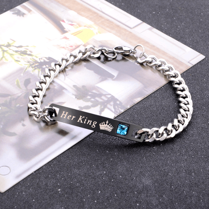 Krijg deze mooie en unieke armband met deze geweldige boodschap die laat zien dat zelfs wanneer je huis misschien niet het Buckingham Palace is, je zeker meer stijl hebt dan een echt koninklijk paar en je wordt door je partner ook als zodanig behandeld, ja, zij is haar koningin en hij is haar koning en daar zijn jullie trots op.