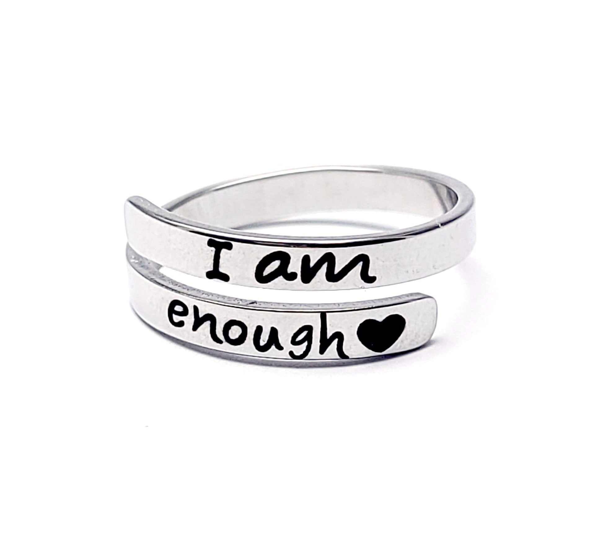 Deze prachtige ring leest 'Ik ben Genoeg' met een klein hartje voor bloei herinnert ons eraan dat we meer dan genoeg zijn. We zijn genoeg voor degenen in ons leven die er echt toe doen.