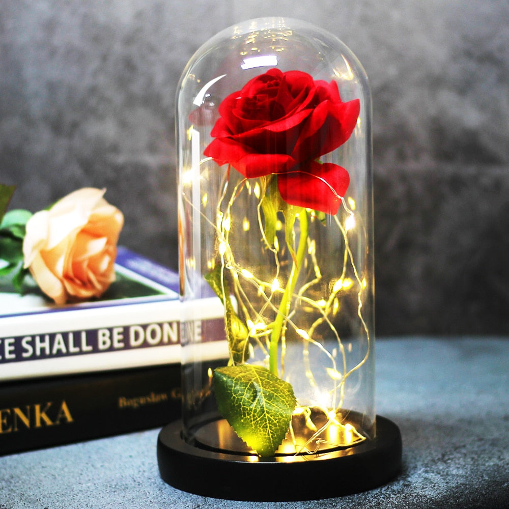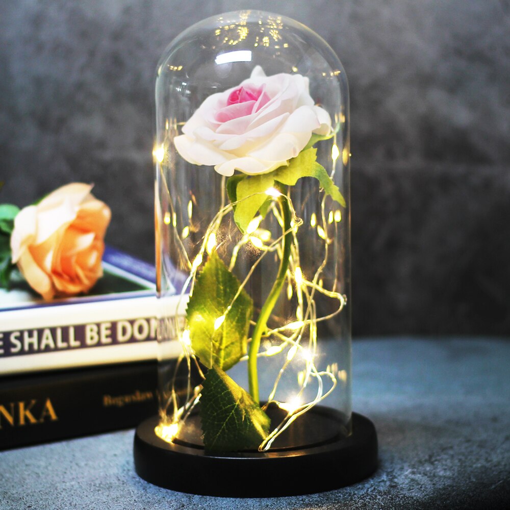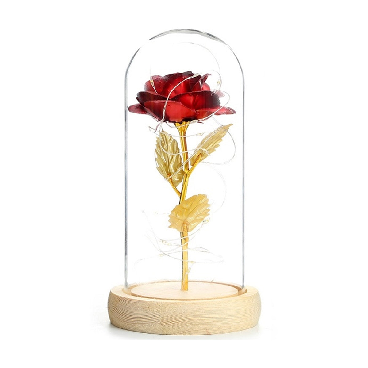 - De verwijderbare glazen koepel is geplaatst op een houten basis, met daarin een enkele magische roos. In de steel van de roos zit een draad zodat je hem in de gewenste vorm kunt buigen. Creëer een schitterende en romantische sfeer voor je familiediner, bruiloft, feest, enz.