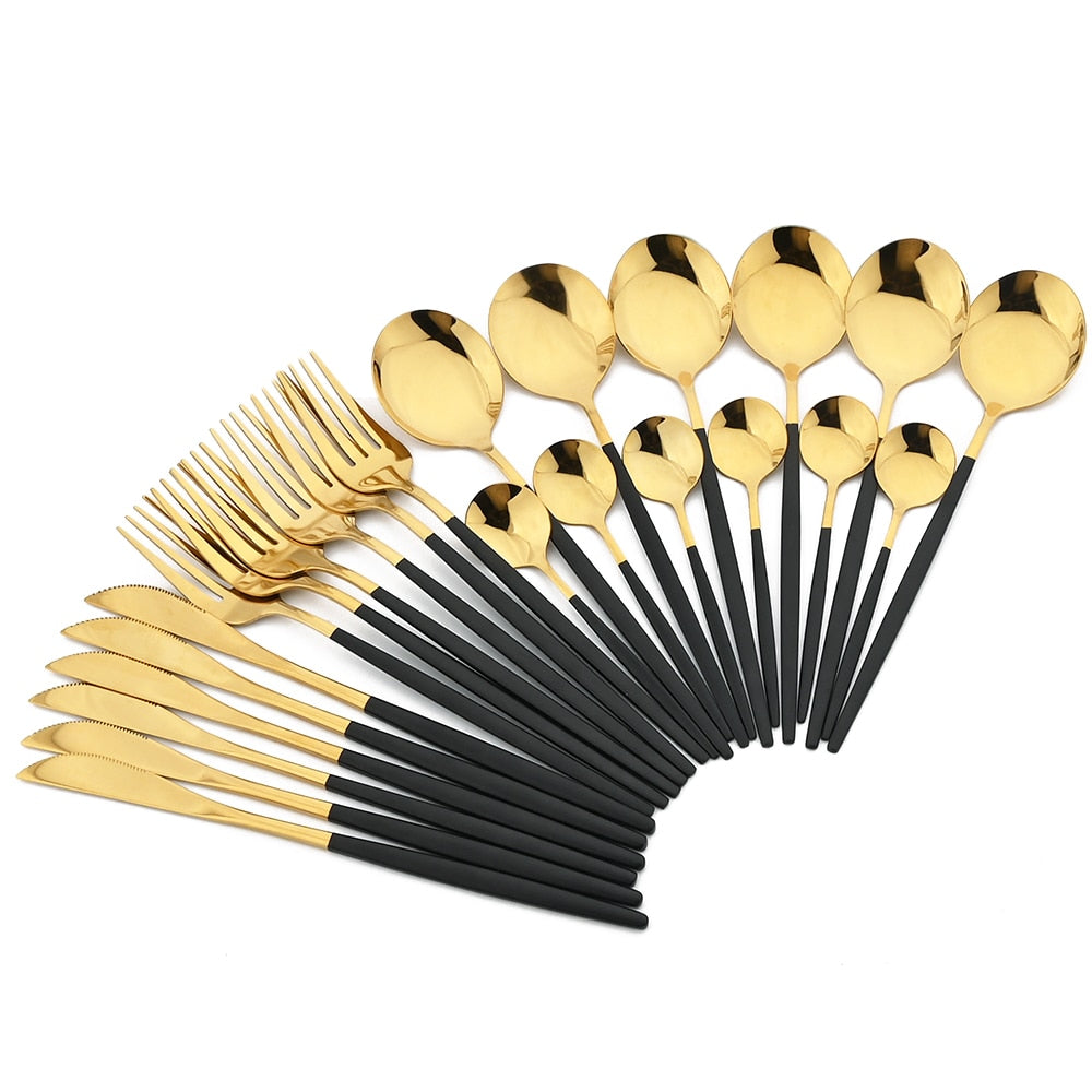 Verhoog je eetervaring met het exclusieve Luxe Bestekset! Een perfecte combinatie van zwarte en gouden accenten die een vleugje elegantie en verfijning aan je tafel brengen. Gemaakt van premium roestvrij staal, biedt deze set uitzonderlijke duurzaamheid, zodat langdurige prestaties en weerstand tegen roest en corrosie gegarandeerd zijn.