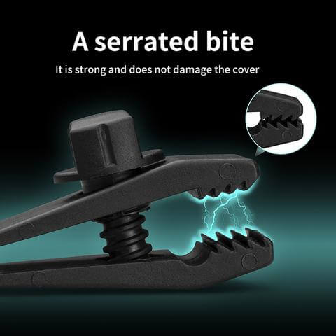 Heavy-duty lock grip tarp clips designed with adjustable spiral thumbscrews and alligator mouth with teeth hold tarps much more stably than normal clips, without using any tools or making a hole.
